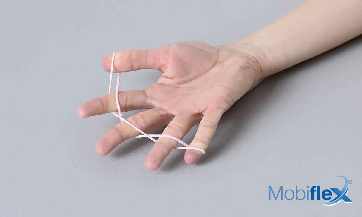 Avec un simple élastique, entourer chaque doigt l’un après l’autre en veillant à faire un demi-tour autour de chaque doigt au niveau de l’articulation du milieu. Ecartez les doigts les uns des autres sans oublier les pouces.