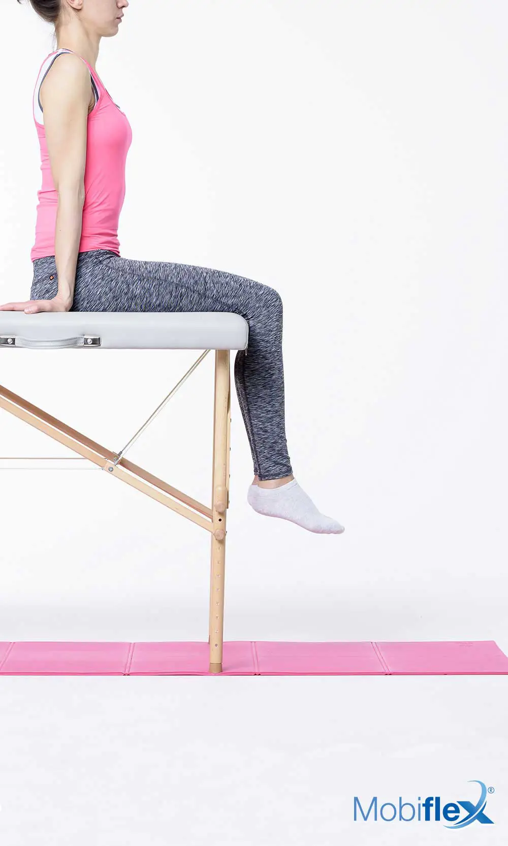 Assis sur une table, le dos bien droit, le regard à l'horizontal, les bras le long du corps, les mains en appui sur la table, le creux du genou (l'arrière du genou) placé au bord de la table, les jambes relâchées vers le sol.