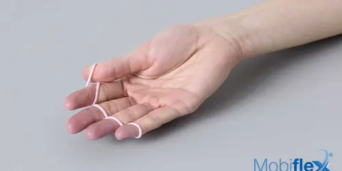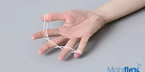 Avec un simple élastique, entourer chaque doigt l’un après l’autre en veillant à faire un demi-tour autour de chaque doigt au niveau de l’articulation du milieu. Ecartez les doigts les uns des autres sans oublier les pouces.
