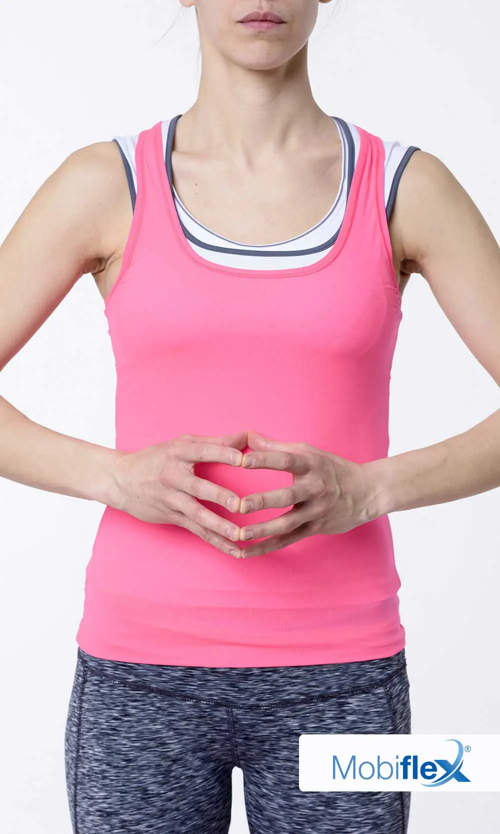 Rapprochez les mains l’une vers l’autre au niveau du nombril en veillant à ce que les pouces et les index se touchent.