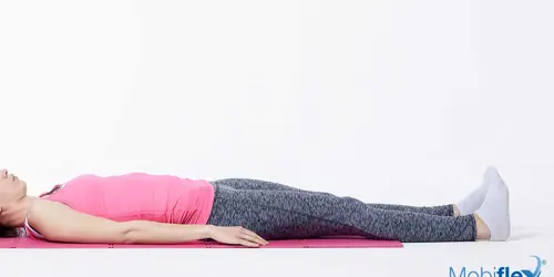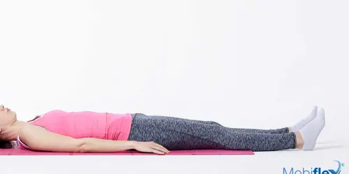 Allongé au sol, les bras le long du corps, les jambes tendues, les orteils pointés vers le plafond.