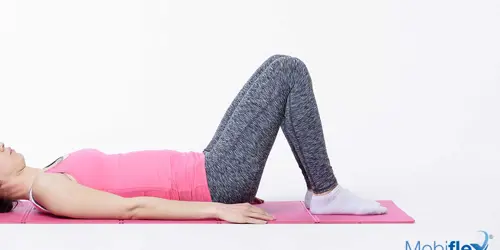Allongé au sol, le dos bien à plat, les bras allongés le long du corps, les genoux pliés et les pieds reposant bien à plat sur le sol.