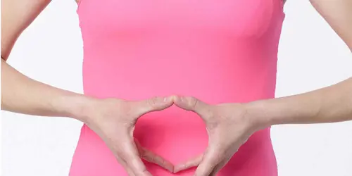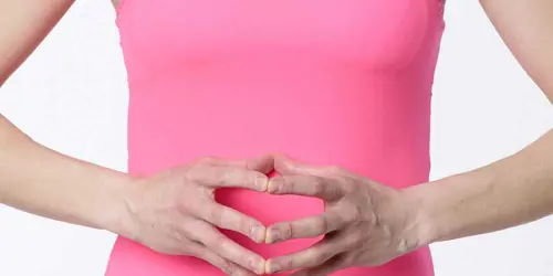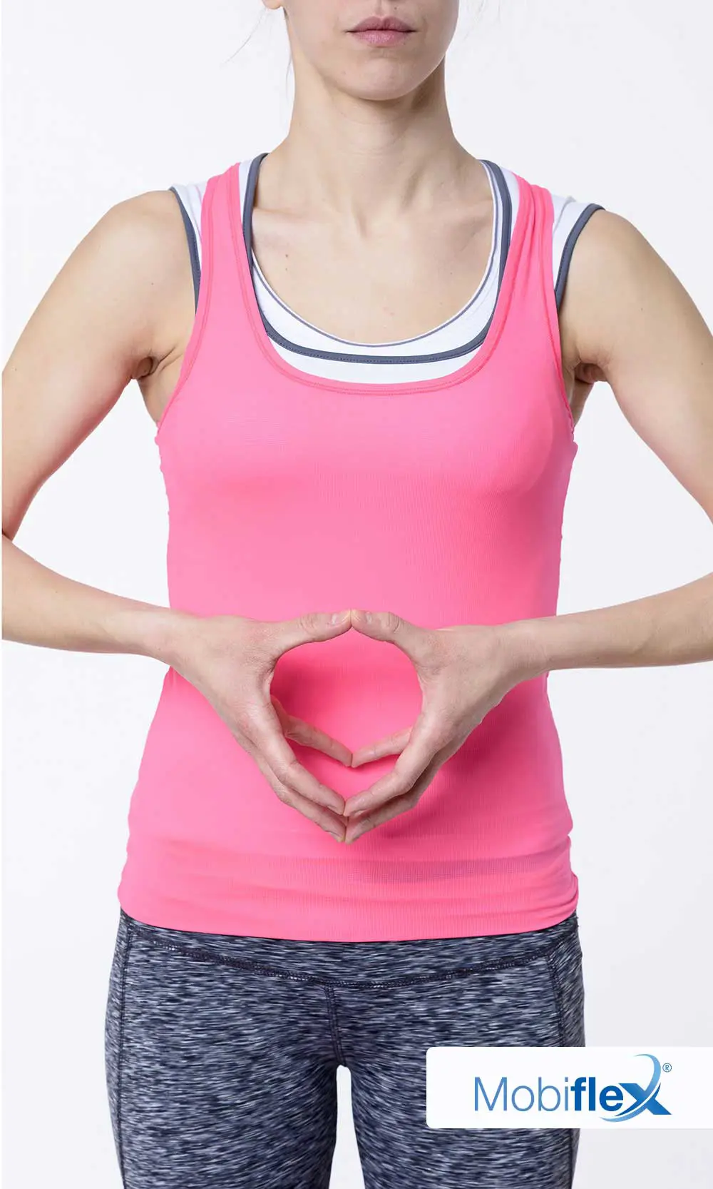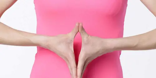 Breng je handen ter hoogte van je navel naar elkaar toe, en zorg ervoor dat je duimen en wijsvingers elkaar raken.