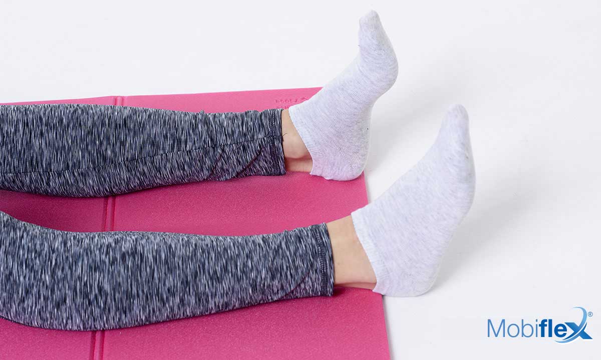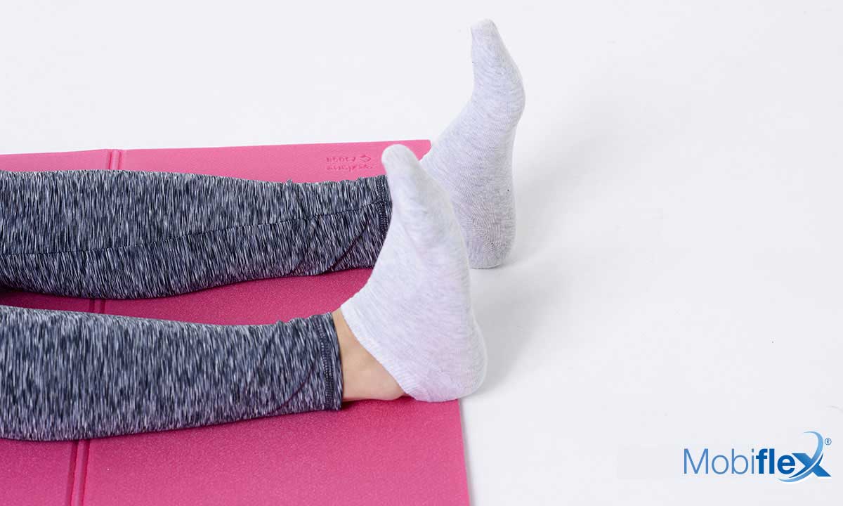 Ga op de grond liggen, armen langs het lichaam, benen gestrekt en tenen naar het plafond.