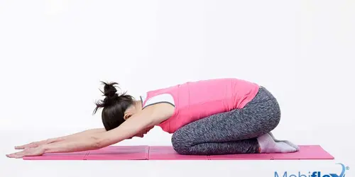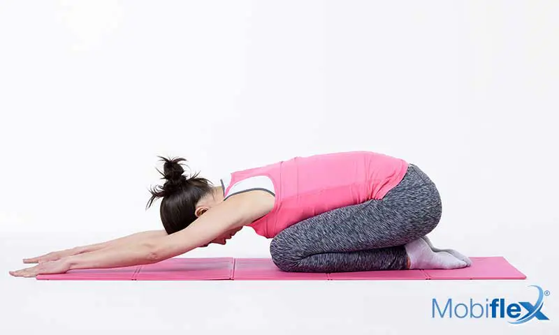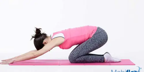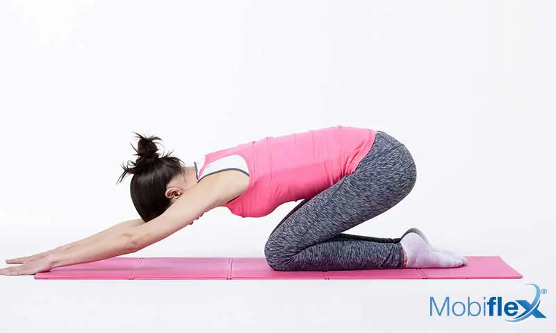 Rek je rug uit door met de handen zachtjes zo ver mogelijk naar voren te reiken, en door je billen rustig naar je hielen te duwen, alsof je jouw ruggengraat langer wil maken.
