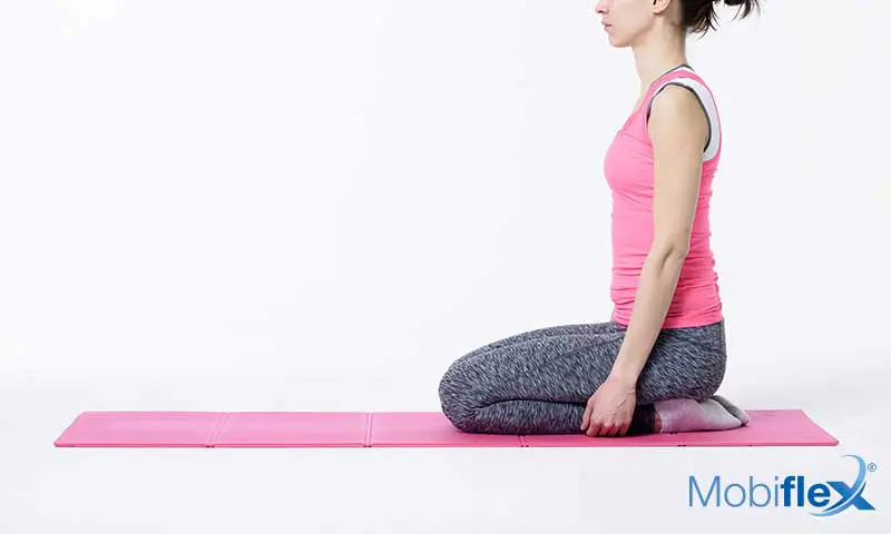Ga op de knieën zitten, benen geplooid, billen op de hielen, rechte rug, en armen langs het lichaam. Kijk naar voren.