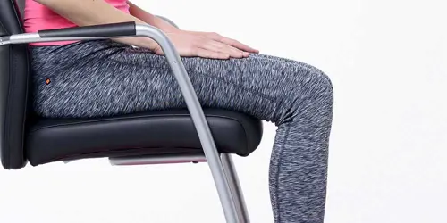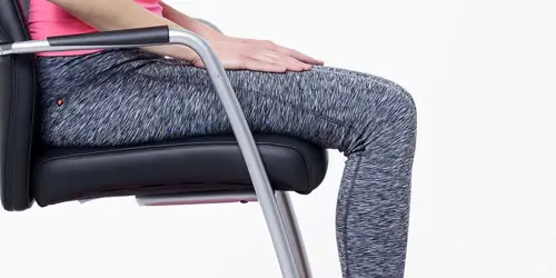 Ga zitten op een stoel, met rechte rug, armen op de leuningen en de blik naar voren gericht.
