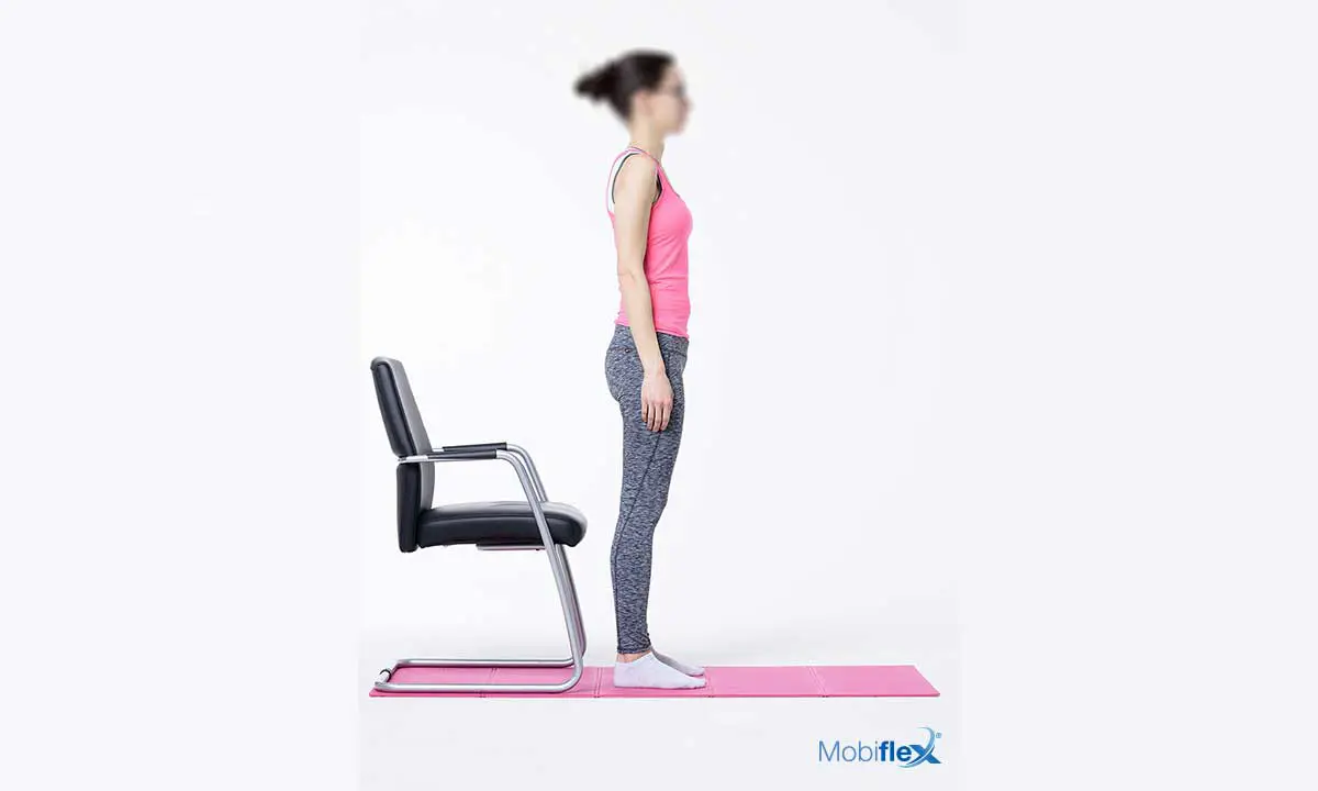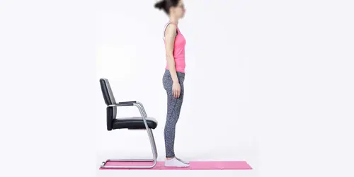 Sta rechtop voor een stoel, de heupen, knieën en voeten op één lijn onder de heupen en de armen los langs het lichaam.