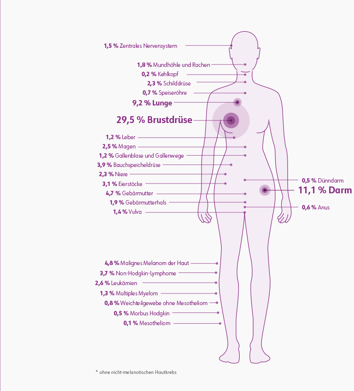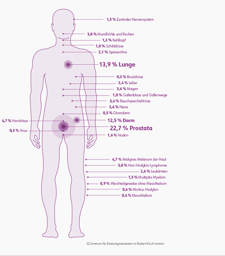Jede achte Krebserkrankung in Deutschland ist hingegen auf Darmkrebs zurückzuführen, hier erkranken sowohl Männer als auch Frauen in ähnlicher Zahl. Der Begriff „Darmkrebs“ benennt dabei vornehmlich die Bereiche des Dickdarms (Kolon), des Enddarms (Mastdarm/Rektum) und des Darmausgangs (Anus).