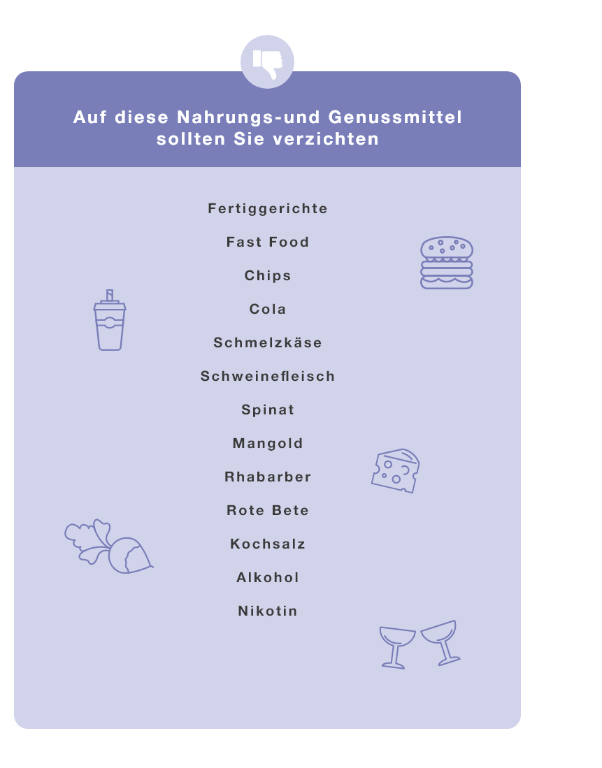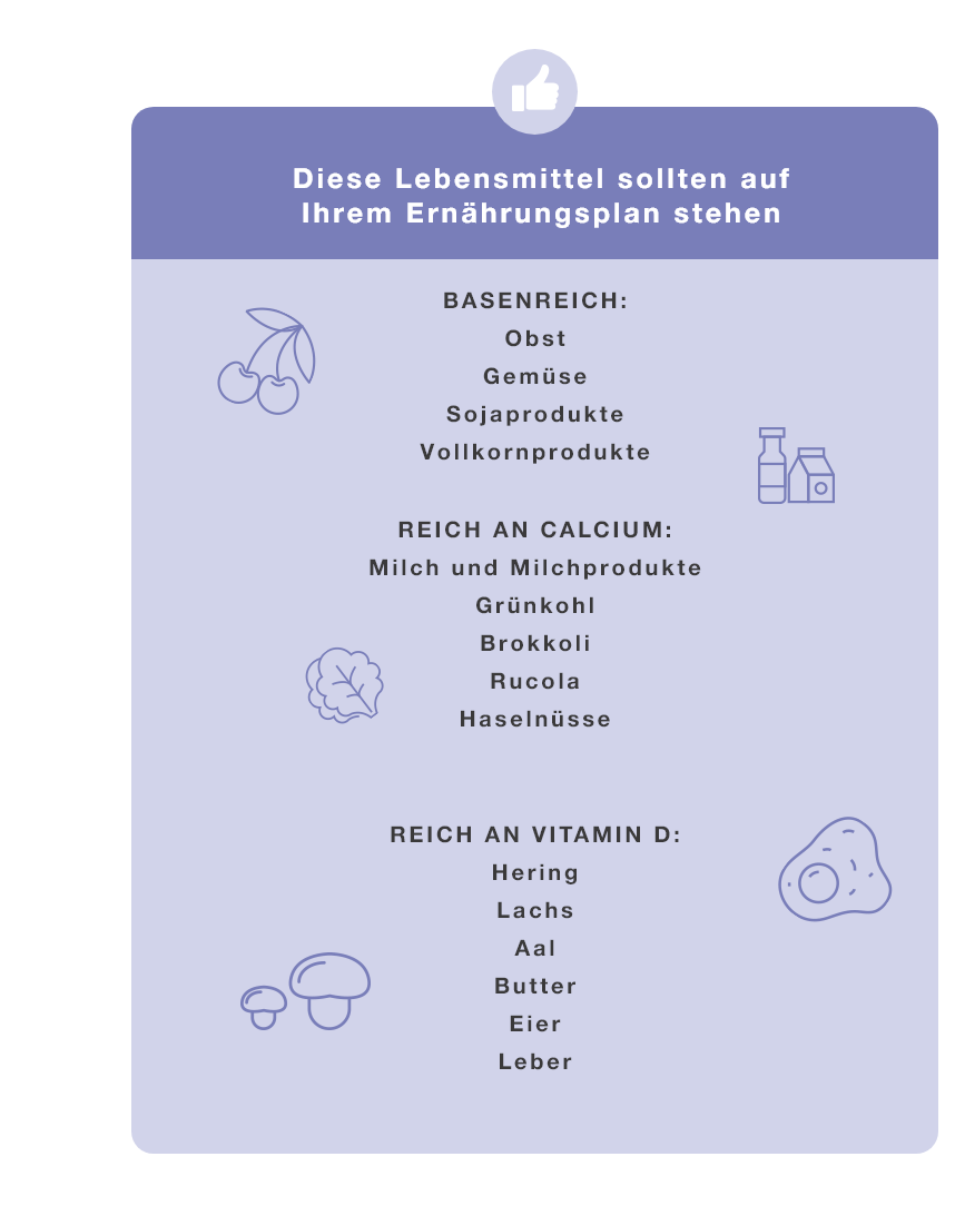 Die Nahrungsmittel in der linken Spalte sind basenreich, bieten eine gute Calciumzufuhr und ausreichend Vitamin D. Auf die Nahrungs- und Genussmittel in der rechten Spalte sollten Sie verzichten oder den Verzehr zumindest einschränken.
