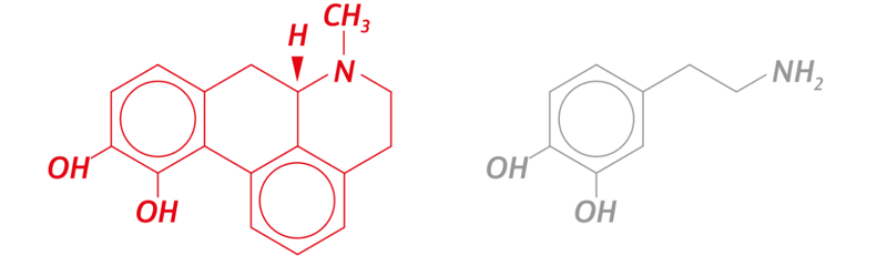 APO-go® enthält den nicht-selektiven Dopaminagonisten Apomorphin, welcher chemisch den Morphin-Derivaten zugeschrieben wird. Trotz seiner Verwandtschaft zu Morphin bindet Apomorphin nicht an Opioidrezeptoren und hat somit keine analgetische Wirkung. Es fällt deshalb nicht unter die Regulation der Betäubungsmittel. Apomorphin besitzt eine sehr ähnliche Struktur zu körpereigenem Dopamin.1 Durch seine stark lipophilen Eigenschaften kann es schnell in das Zentralnervensystem gelangen.2