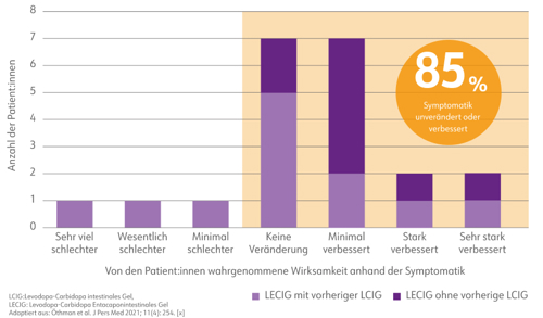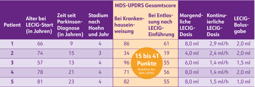In einer Beobachtungsstudie mit 5 Patient:innen zeigte sich auch eine verbesserte Lebensqualität gemessen am MDS-UPDRS-Gesamtscore (Movement Disorder Society - Unified Parkinson's Disease Rating Scale) nach Beginn der Therapie mit LECIGON®.3