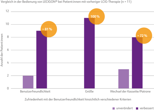 Um die Benutzerfreundlichkeit der LECIGON®-Therapie zu analysieren, wurden Patient:innen (n=11) zu verschiedenen Bedienfaktoren im Vergleich zu ihrer vorherigen LCIG-Therapie befragt.