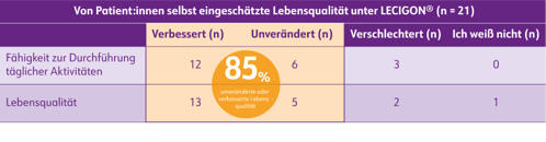 85 % der Patient:innen empfanden nach dem Wechsel zu LECIGON® ihre Symptomatik als verbessert oder unverändert (n=21).
