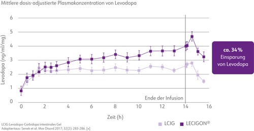 3-OMD: 3-O-Methyldopa, AUC: Fläche unter der Kurve (area under curve), LCIG: Levodopa-Carbidopa intestinales Gel, LECIG: Levodopa-Carbidopa Entacapon intestinales Gel. Adaptiert aus: Senek et al. 20171