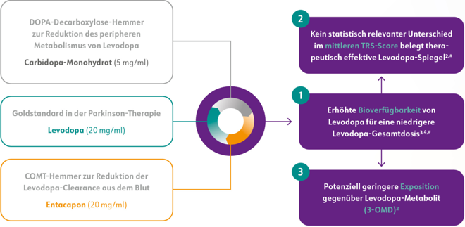 LECIGON® ist eine neuartige Kombination aus den drei etablierten Parkinson-Wirkstoffen Levodopa, Carbidopa und Entacapon in einer Gelformulierung zur kontinuierlichen Applikation in den Darm (Duodenum oder oberes Jejunum).1