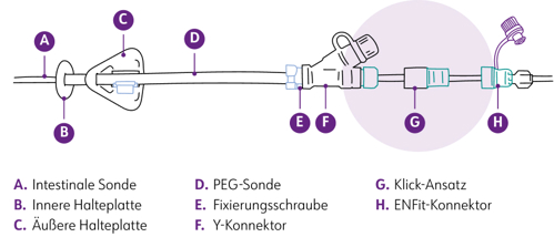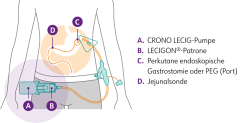 LECIGON® intestinales Gel8 wird mithilfe der CRONO LECIG-Pumpe kontinuierlich in den Darm (Duodenum oder oberes Jejunum) appliziert. Dies erfolgt über eine perkutane endoskopische Gastrostomie mit Jejunalsonde (JET-PEG). Bei der Umstellung der Therapie von oralem Levodopa auf LECIGON® ist ein chirurgischer Eingriff zur Anlage einer JET-PEG erforderlich. Eine Neuanlage des JET-PEG ist nicht notwendig, wenn bereits eine JET-PEG von LCIG vorhanden ist, da die Applikation über den gleichen PEG-Sondenanschluss erfolgen kann.