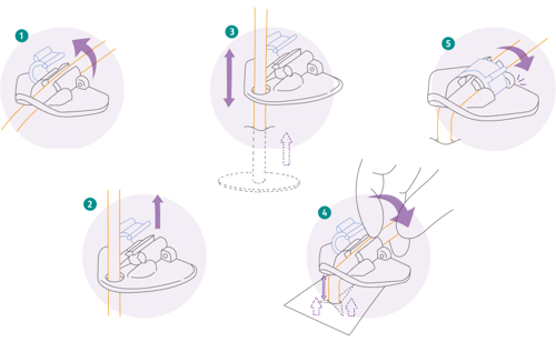 Trockene Schlitzkompresse auf das Stoma legen. Halteplatte wieder in Position schieben und befestigen. Der Abstand zwischen Haut und Halteplatte sollte ungefähr 5 mm betragen. Abschließend den Sondenschlauch in der äußeren Halteplatte positionieren.