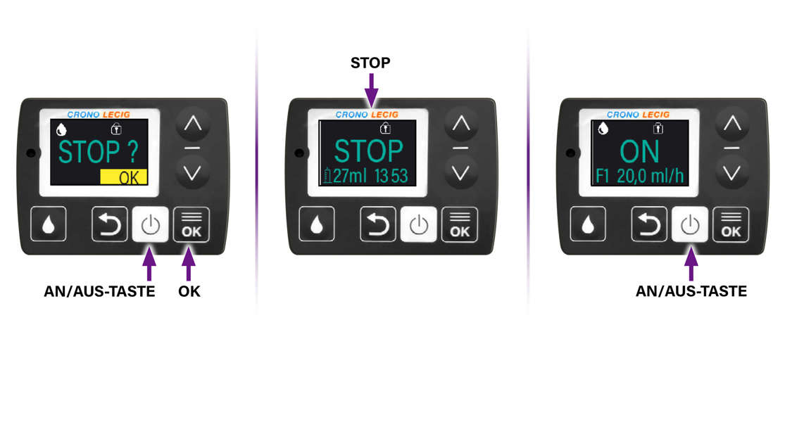 - Sobald das Wort "STOP" auf dem Display erscheint ist die Infusion unterbrochen.