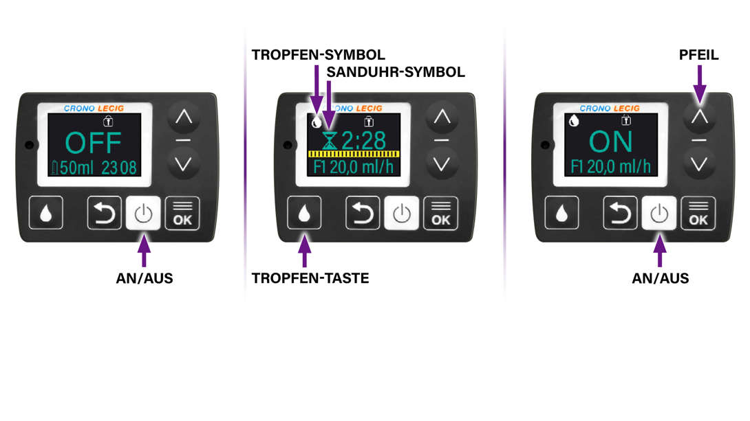 - Zum erneuten Starten der Infusion müssen Sie die AN/AUS-Taste gedrückt halten bis das Wort „ON“ auf dem Display erscheint.