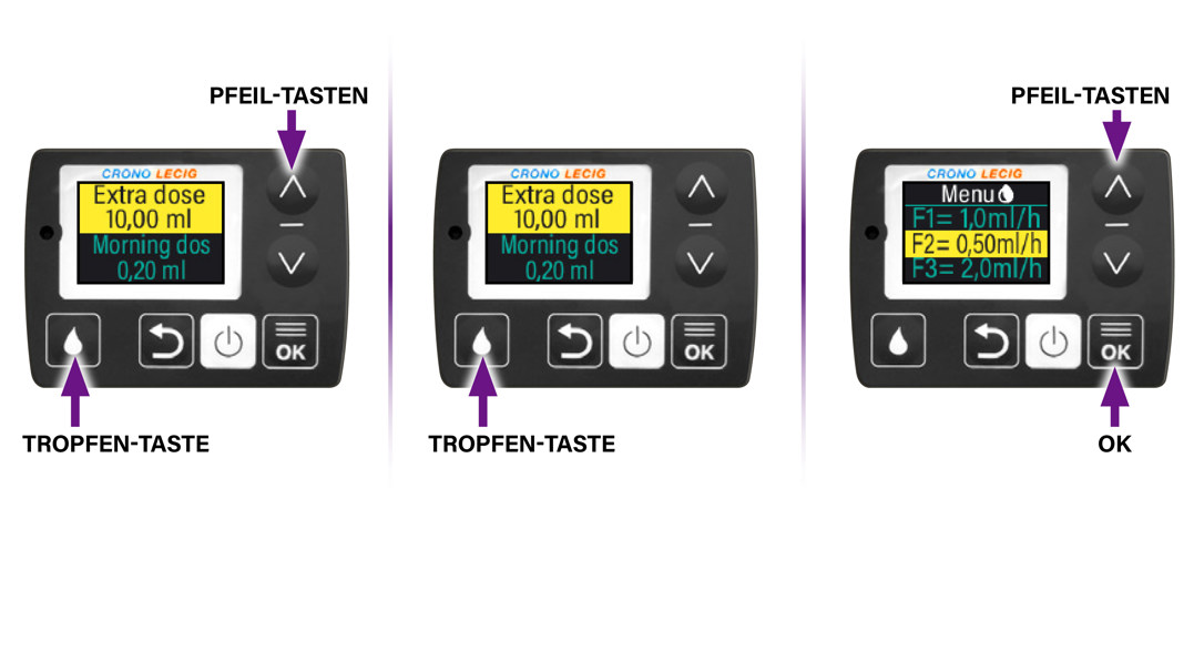 - Sie können zwischen Extradosis und Morgendosis wechseln, indem Sie die TROPFEN-Taste gedrückt halten und mithilfe der PFEIL-Tasten zwischen Extra und Morgendosis auswählen.