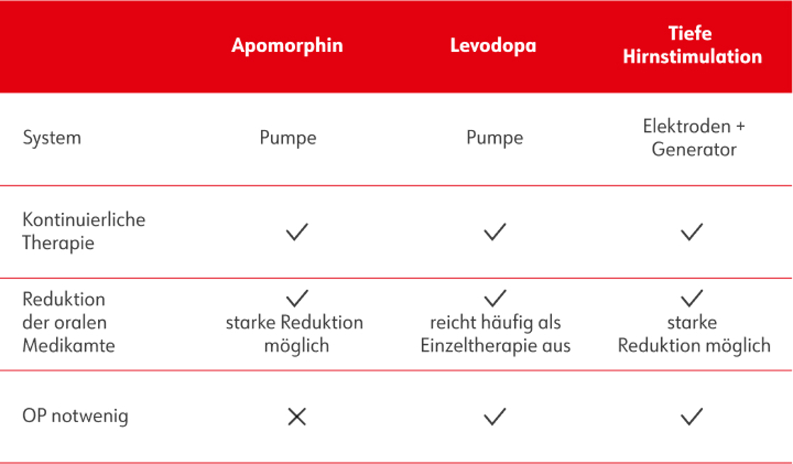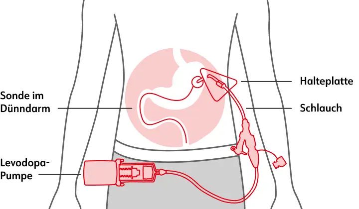 Eine orale Parkinson-Behandlung führt im Langzeitverlauf fast immer zu Wirkungsschwankungen. Ist der Magen-Darm-Trakt ebenfalls von der Erkrankung betroffen, kann zudem die Wirkstoffaufnahme beeinträchtigt sein. Eine verlangsamte Verdauung im Magen (Gastroparese) ist vor allem bei Patient:innen im mittleren Stadium zu beobachten. Wenn dann die orale Medikamentengabe nicht mehr ausreicht und auch die Erhöhung der Dosis nicht hilft, die Parkinson-Symptome in den Griff zu bekommen, bieten sich geräteunterstützte Therapieoptionen als Alternative an. Zu diesen gehören eine pumpenbasierte Verabreichung von Apomorphin oder Levodopa sowie die tiefe Hirnstimulation.