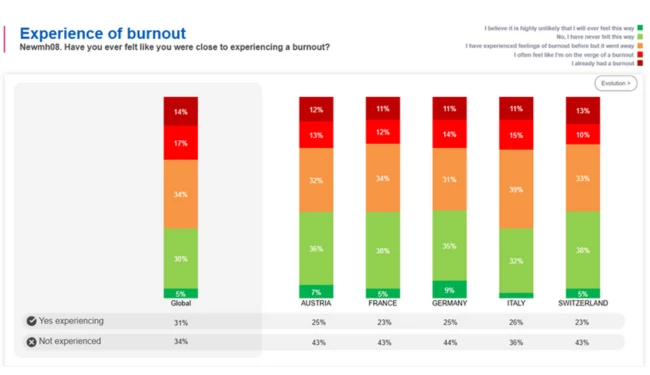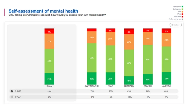 La population suisse affiche une grande résilience mentale : 74 % des personnes interrogées estiment que leur santé mentale est bonne ; un chiffre record qui place la Suisse au troisième rang européen. Seules 6 % déclarent souffrir d’une mauvaise santé mentale. Fait particulièrement remarquable : 43 % des Suisses affirment ne s’être jamais sentis proches d’un burn-out, un taux nettement supérieur à la moyenne européenne, qui s’élève à 34 %.