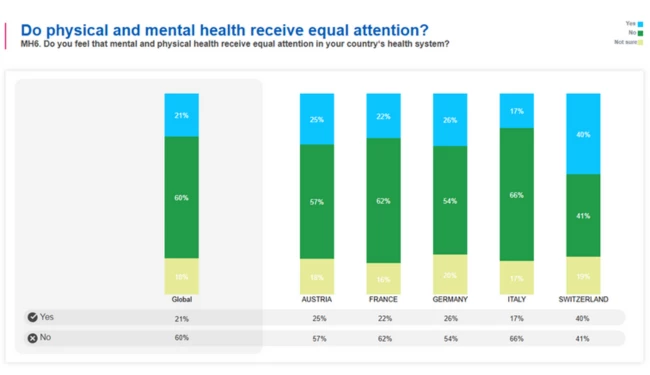 En Suisse, l’importance de la santé mentale est de plus en plus reconnue. 40 % des personnes interrogées estiment que la santé mentale et la santé physique sont traitées de manière équivalente dans le système de santé, soit près du double de la moyenne européenne, qui s’élève à 21 %.