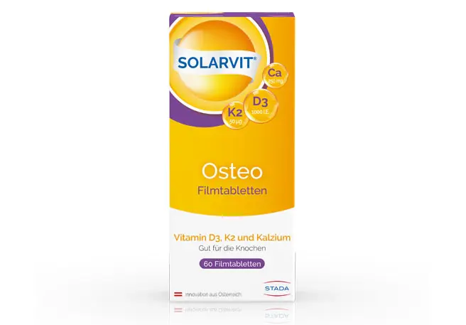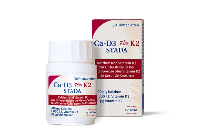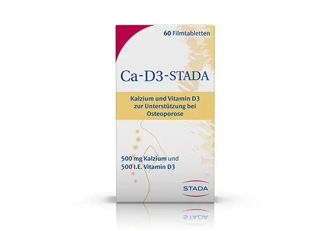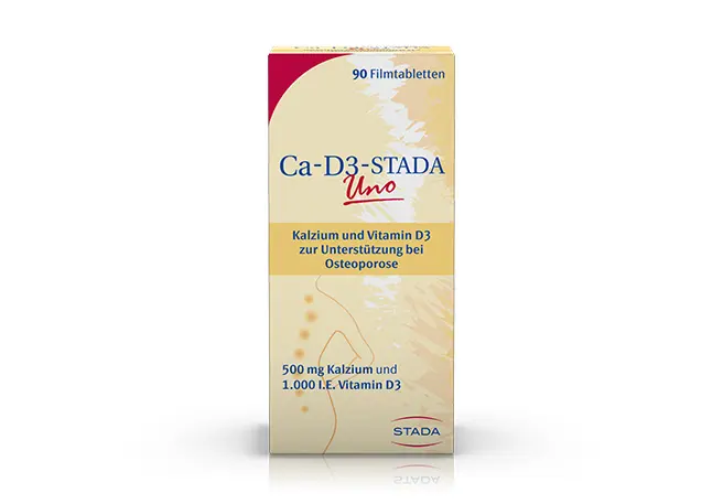 Ca-D3-STADA-Filmtabletten mit Kalzium und dem knochenstabilisierenden Sonnenvitamin D3 wurden speziell zur Unterstützung bei Osteoporose entwickelt. Daneben bietet STADA mit der führenden Vitamin-D3-Marke SOLARVIT® ein breites Angebot an unterschiedlich dosierten Vitamin-D3-Mono-Präparaten sowie Kombinationsprodukte mit hoch bioverfügbarem Vitamin K2 (MK-7) und Kalzium an.
