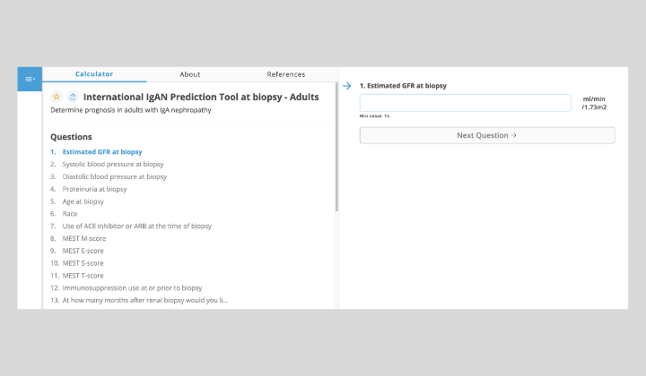 Zur Vermeidung einer Über- oder Unterbehandlung wurde ein internationaler Risikoprognoserechner entwickelt, welcher das Fortschreiten der IgA-Nephropathie zum Zeitpunkt der Nierenbiopsie vorhersagen kann.1 Dieser Rechner nutzt die eGFR und die Proteinurie als Surrogatmarker sowie andere Werte, wie den mittleren arteriellen Blutdruck (MAP), den Body-Mass-Index (BMI), das Alter, die bisherige Medikation und den MEST-Wert zur Bewertung der Nierenfunktion. Der MEST-Score basiert auf der Nierenhistologie und umfasst vier Komponenten: mesangiale (M) und endokapilläre (E) Hyperzellularität sowie segmentale (S) und interstitielle Fibrose/Tubulusatrophie (T). Ein weiterer neu entwickelter Prognoserechner berücksichtigt darüber hinaus auch bestimmte ethnische Merkmale.1
