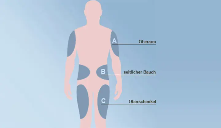 Beim Auftreten motorischer Symptome (OFFs) kann der Pen zur Anwendung kommen. Ähnlich wie bei einem Insulin-Pen wird beim Apomorphin Pen der Wirkstoff direkt in das Fettgewebe der Haut injiziert. In der Grafik sehen Sie, welche Körperregionen dafür in Frage kommen.