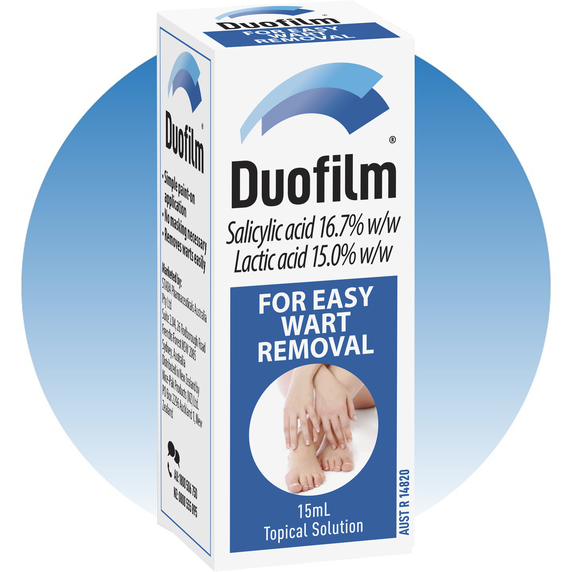 Duofilm is a medication for the topical treatment of warts. The 15 ml glass bottle, with brush applicator, contains the active ingredients salicylic acid (16.7 %) and lactic acid (15 %). Applied topically, salicylic acid acts on the surface layer of the skin to promote shedding (desquamation). Lactic acid suppresses the wart skin thickening process. The elastic colloidal film provides a viscous vehicle for accurate application and the penetration of active ingredients into warts. The lactic acid also forms a film that helps keep the skin moisturised, facilitating the elimination of warts.