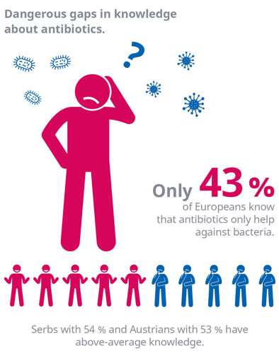 Two thirds of Europeans incorrectly think antibiotics are a remedy for other pathogens – a third (32%) think that they help against viruses, a fifth (21%) believe they fight fungal infections, and 4% would even employ antibiotics to treat tumors. Indeed, 5% mistakenly believe that antibiotics help against all of the above. Another seven percent give in with an "I don't know”. A mere 43% of Europeans know that only bacterial infections can be treated with antibiotics; therefore, more than half of them have little ideal when taking antibiotics makes sense. Serbs (54 percent) and Austrians (53 percent) have above-average knowledge of the appropriate use of antibiotics.