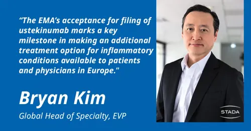 “The EMA’s acceptance for filing marks a key milestone in making an additional treatment option for inflammatory conditions available to patients and physicians in Europe,” commented STADA’s Head of Specialty, Bryan Kim. “Authorization for ustekinumab would add to STADA’s extensive range of six approved biosimilars in Europe, a portfolio that includes a high-concentration, citrate-free of adalimumab brought to market through our strategic partnership with Alvotech.”