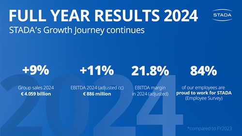 Bad Vilbel – 7 March 2025 - STADA, a leading healthcare and pharmaceutical company in Consumer Healthcare, Generics and Specialty pharmaceuticals, continued its profitable growth journey in 2024. STADA again outperformed market sales growth in all three business segments – supported by its strong commercial network in Europe, and complemented by a growing presence in the MENA, Eurasia and Asia-Pacific regions. Group sales grew by 9% to € 4.059 billion versus the 2023 financial year. At the same time, earnings before interest, taxes, depreciation and amortization, adjusted for special items and currency effects, (adj. cc EBITDA) rose by 11% to € 886 million, while the adj. cc EBITDA margin increased further to 21.8%.