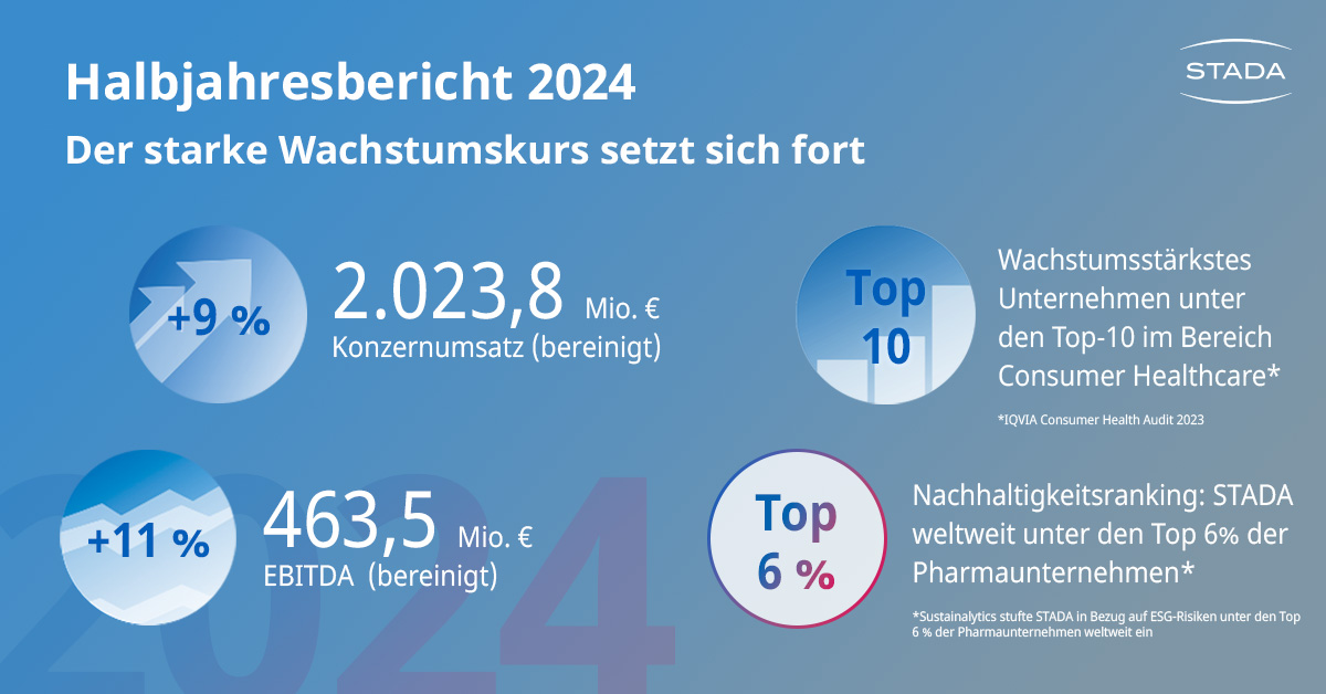 Bad Vilbel – 28. August 2024 – Die STADA Arzneimittel AG ist erfolgreich ins Geschäftsjahr 2024 gestartet und hat einen Halbjahresumsatz von 2,02 Mrd. € erzielt. Der Konzernumsatz stieg in den sechs Monaten bis zum 30. Juni 2024 um 9 % im Vergleich zum Vorjahreszeitraum und lag damit über der Marktentwicklung. Durch strategische Wachstumsinitiativen stieg der um Währungseffekte und Sondereffekte bereinigte Gewinn (EBITDA) um 11 % auf 463,5 Mio. €.