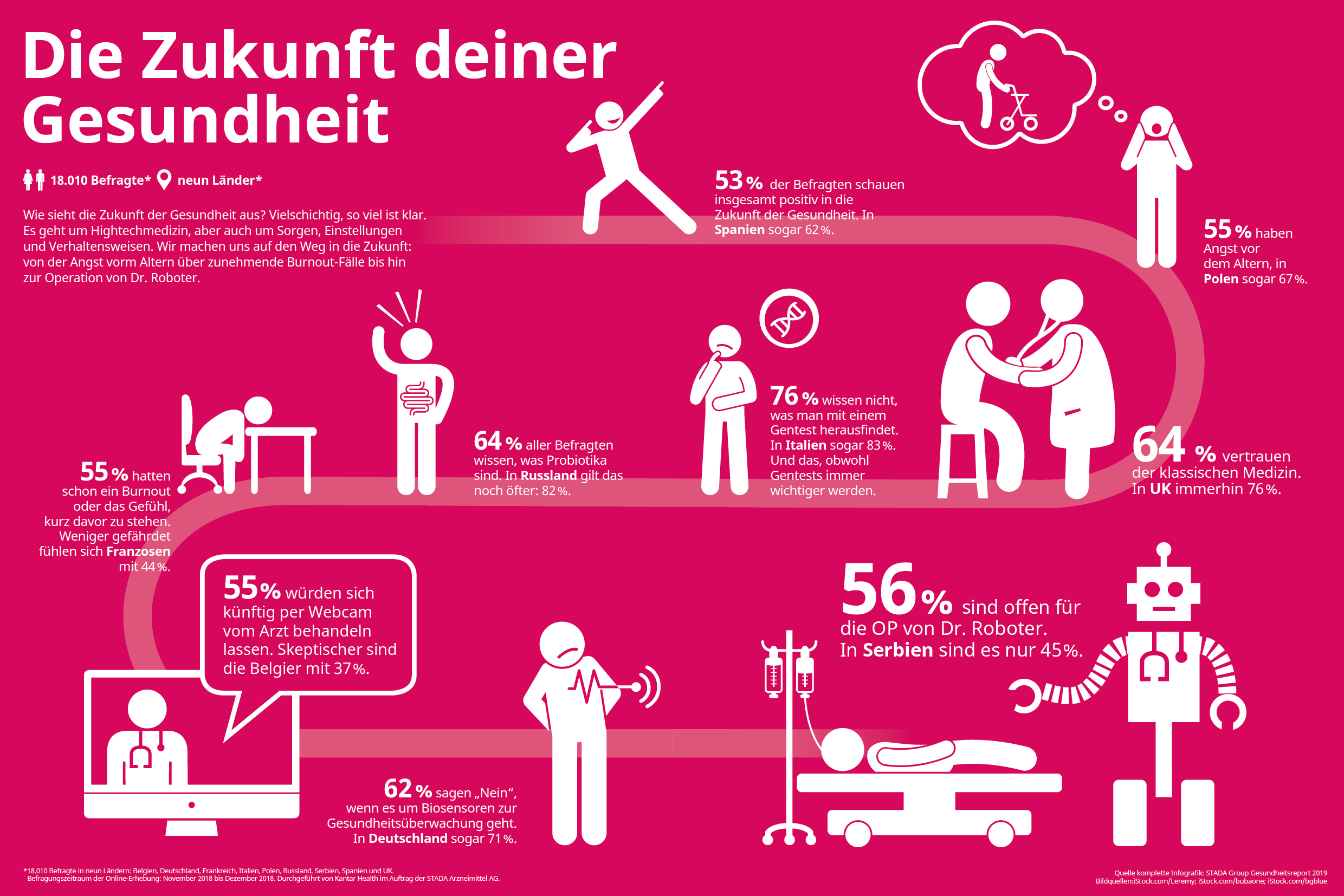 Wie sieht die Zukunft der Gesundheit aus? Vielschichtig, so viel ist klar. Es geht um Hightech-Medizin, aber auch um Sorgen, Einstellungen und Verhaltensweisen. Wir machen uns auf den Weg in die Zukunft: Von der Angst vorm Altern, über zunehmende Burnout-Fälle bis hin zur Operation von Dr. Roboter.