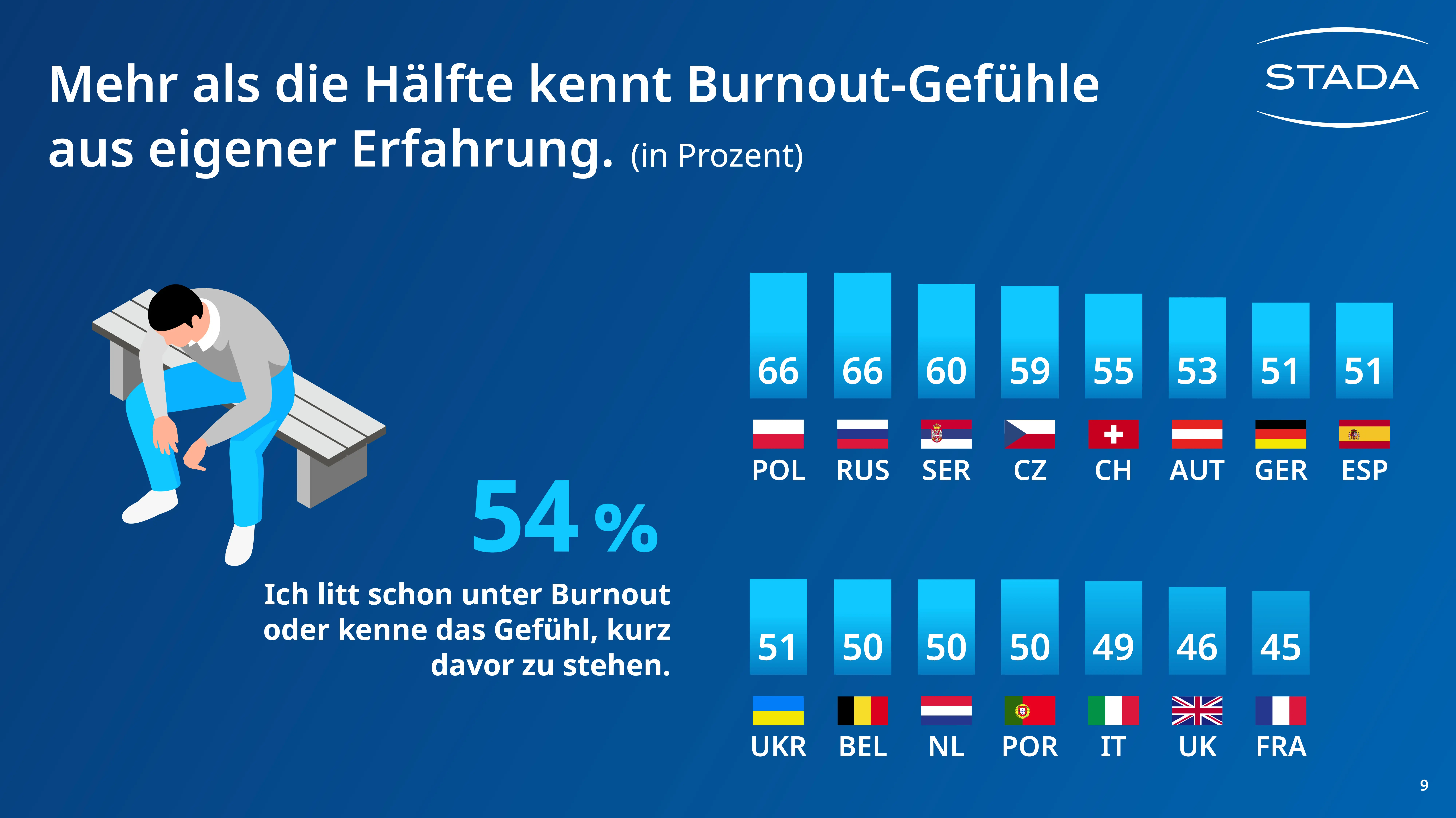 - Der selbsteingeschätzte Anteil der Europäer mit Burnout-Risiko bleibt mit 54 Prozent hoch