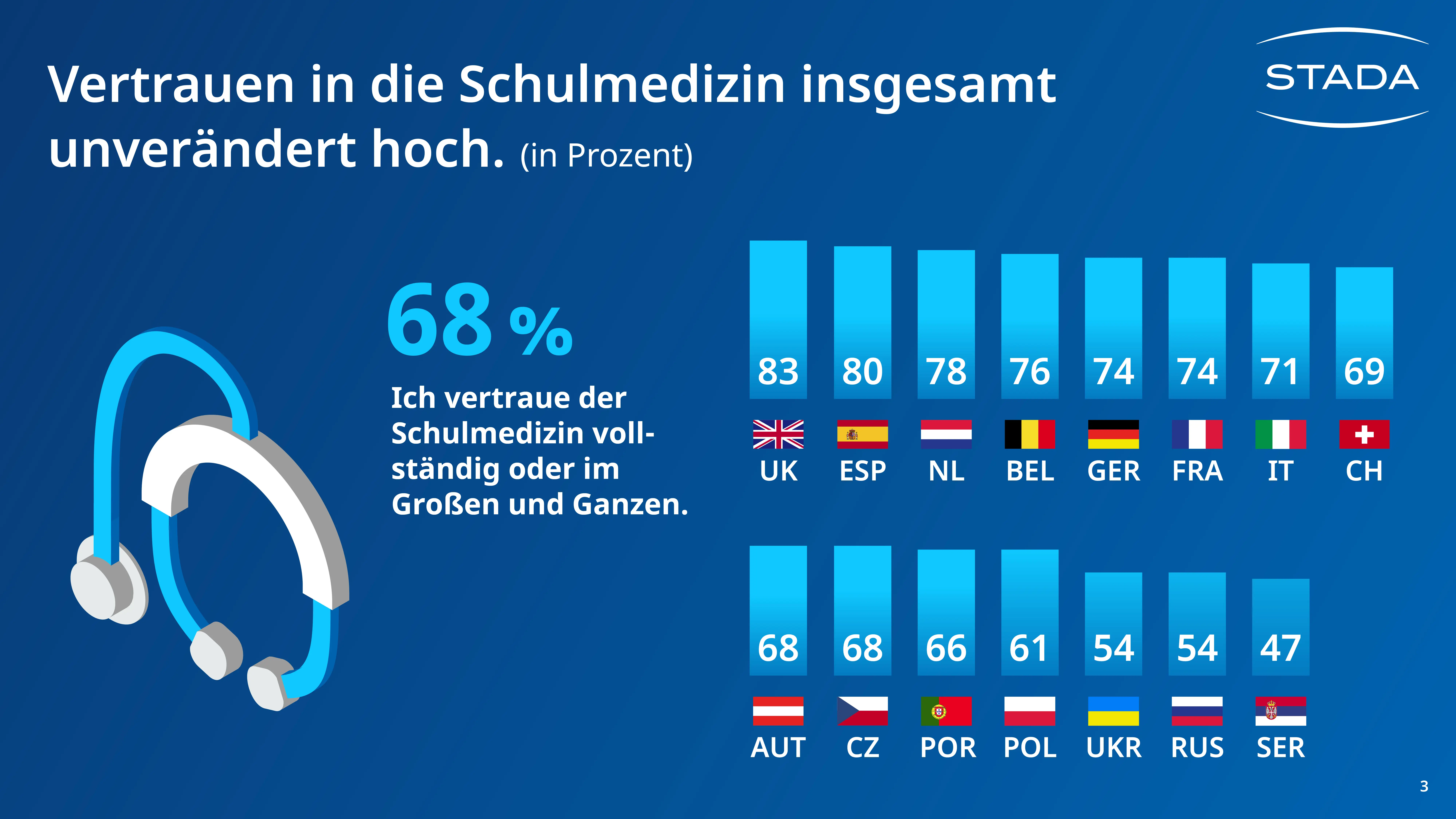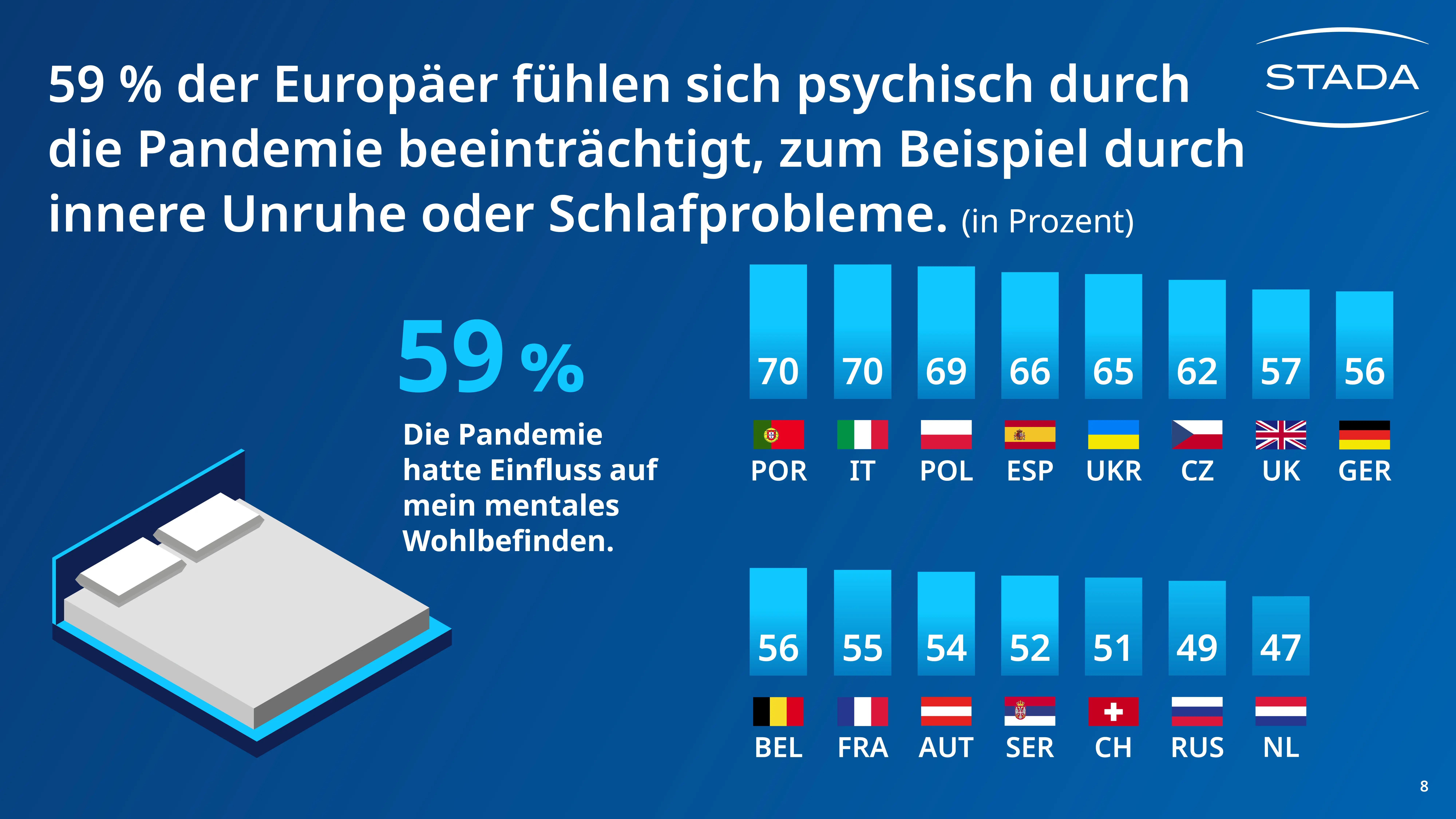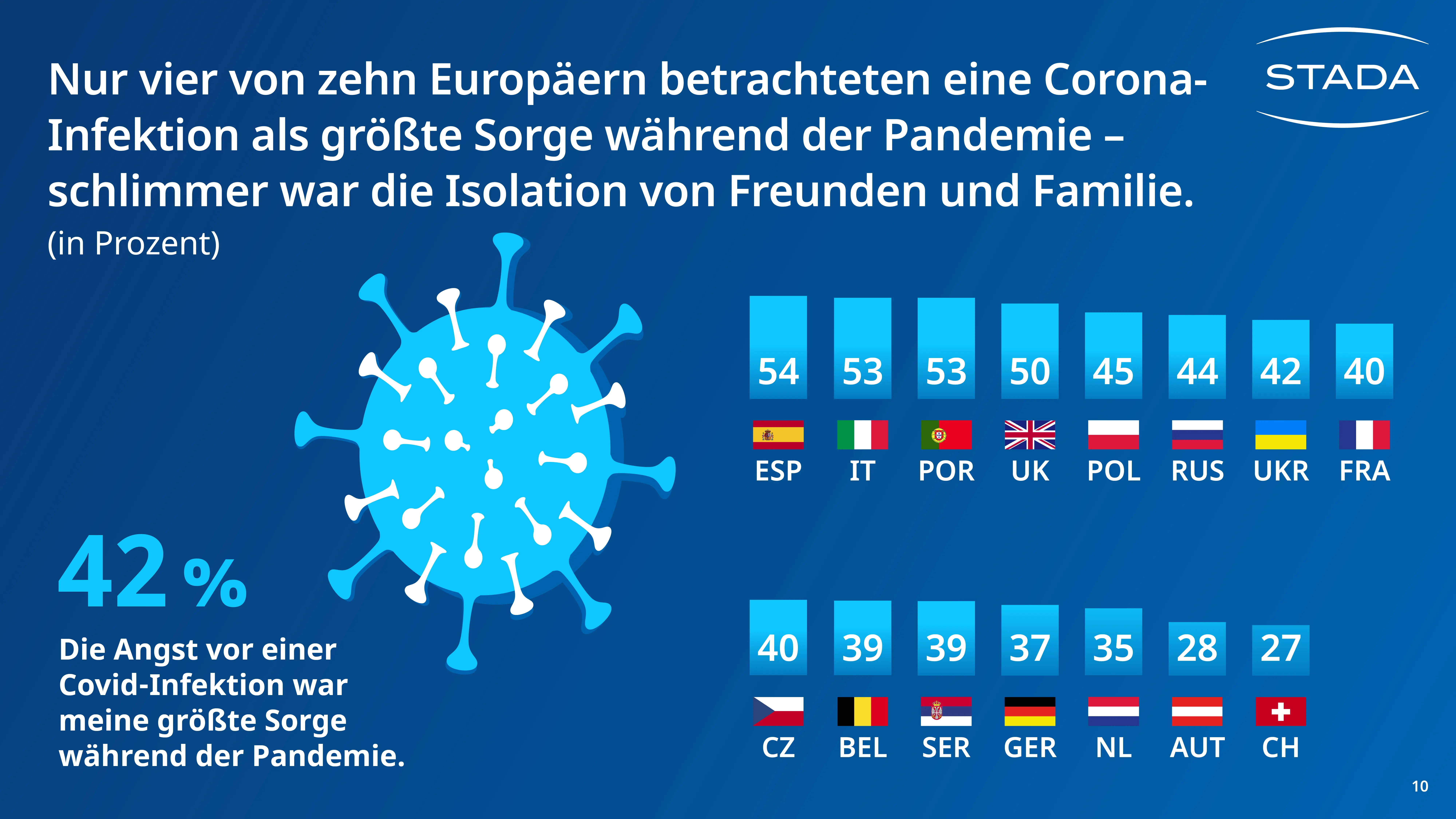 30.000 Befragte, 15 Länder, 34 Fragen: Der STADA Health Report 2021 ist die bisher umfangreichste Gesundheitsstudie. Während einer der seltsamsten und turbulentesten Zeiten der jüngeren Geschichte wollten wir den Menschen in Europa auf den Zahn fühlen und herausfinden: Was hat sie während der Pandemie belastet? Wem vertrauen sie, wenn es um Gesundheitsfragen geht? Hat sich ihre Einstellung zu Gesundheit und gesunder Lebensweise durch Corona verändert?