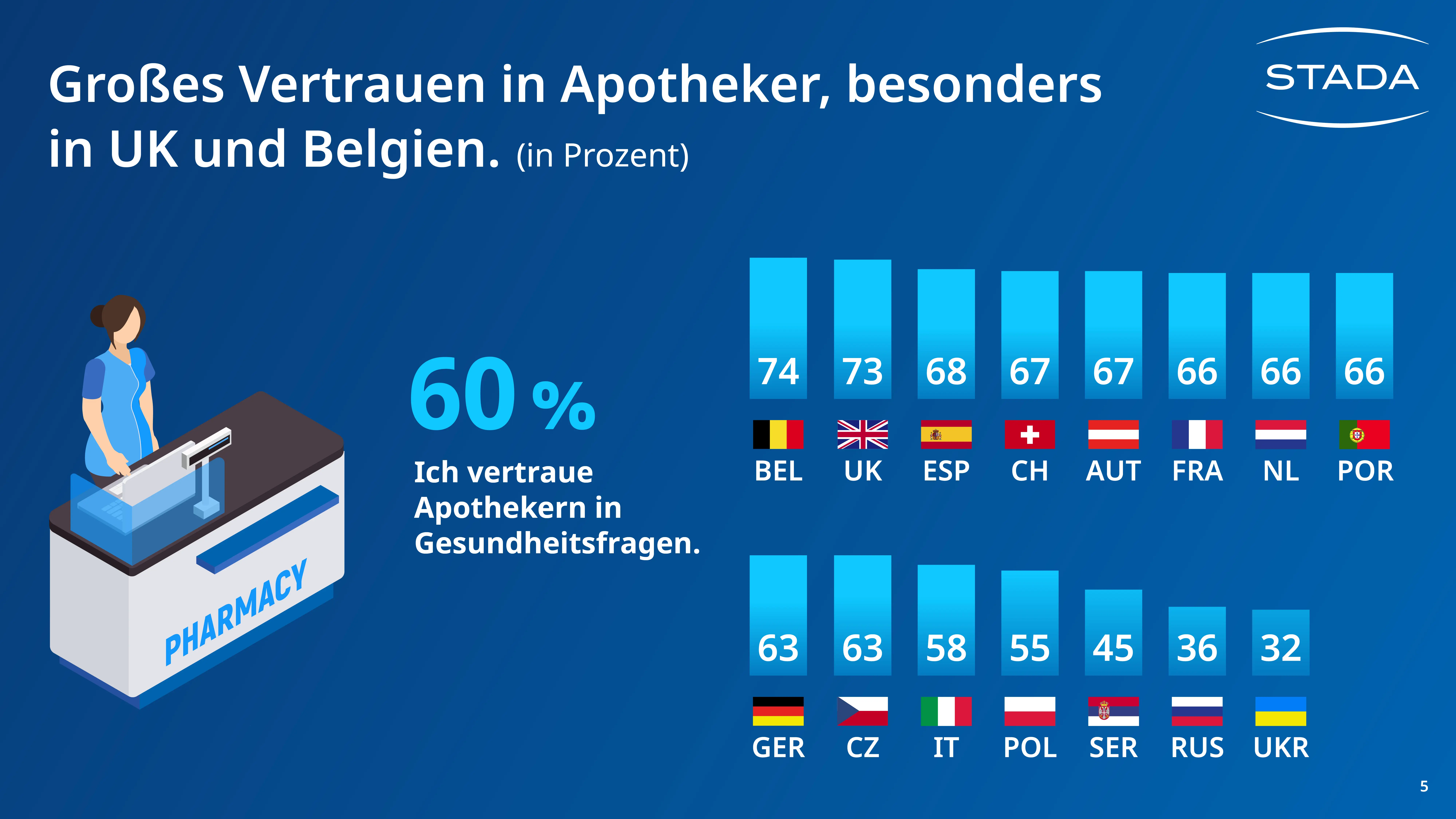 In Kooperation mit dem Marktforschungsunternehmen Kantar haben wir die Onlineumfrage von Mitte März bis Mitte April 2021 durchgeführt. Pro Land wurden rund 2.000 Personen im Alter zwischen 18 und 99 Jahren befragt – wie immer repräsentativ für die Merkmale Geschlecht, Region und Alter. Der vorherige Health Report, der im Juni 2020 veröffentlicht wurde, basierte auf den Ergebnissen einer Onlineumfrage, die von Februar bis März 2020 durchgeführt wurde, also noch vor dem Ausbruch von Corona in Europa. Etwas später, im April 2020, wurde in fünf teilnehmenden Ländern eine Sonderumfrage durchgeführt, die die Datengrundlage für ein spezielles Corona-Kapitel im Health Report 2020 lieferte. Erfahren Sie mehr über das Studiendesign und die Methodik des STADA Health Report 2021: