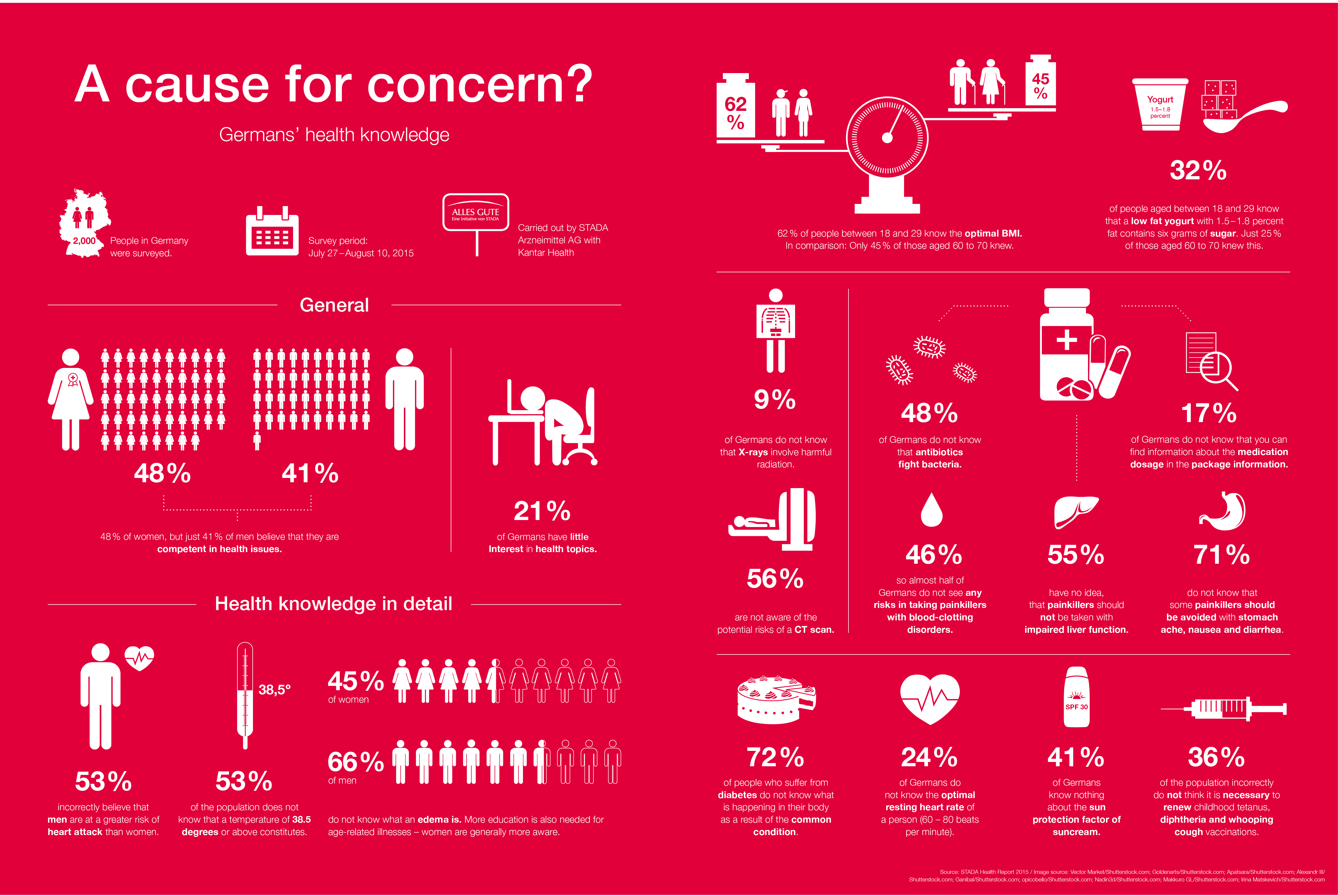 One in two Germans do not know enough about their health. That was the conclusion of a current survey which is conducted by STADA in cooperation with the market research institut Kantar Health. Around half of Germans have no idea what antibiotics are used for or what temperature is considered fever. Also of concern: 21% of German have little interest in health topics. Overall women are more competent then men in healt issues, those with a higher level of education have better knowledge than those with a lower level of education, older people know more than younger people. Nevertheless the answers reveal gaps in knowledge in many areas of health and within different social groups. With the study of Germans’ health knowledge, the STADA Health Report will now begin its second round, after it started with a survey in Autumn 2014 about people’s attitudes, wishes and behavior towards their health. As part of the "Health Report 2015", market research institute conducted online a population-representative survey of 2,000 people, aged between 18 and 70. During the study concept development we involved high-ranking support in the form of the renowned doctor and author, Dr. Johannes Wimmer.