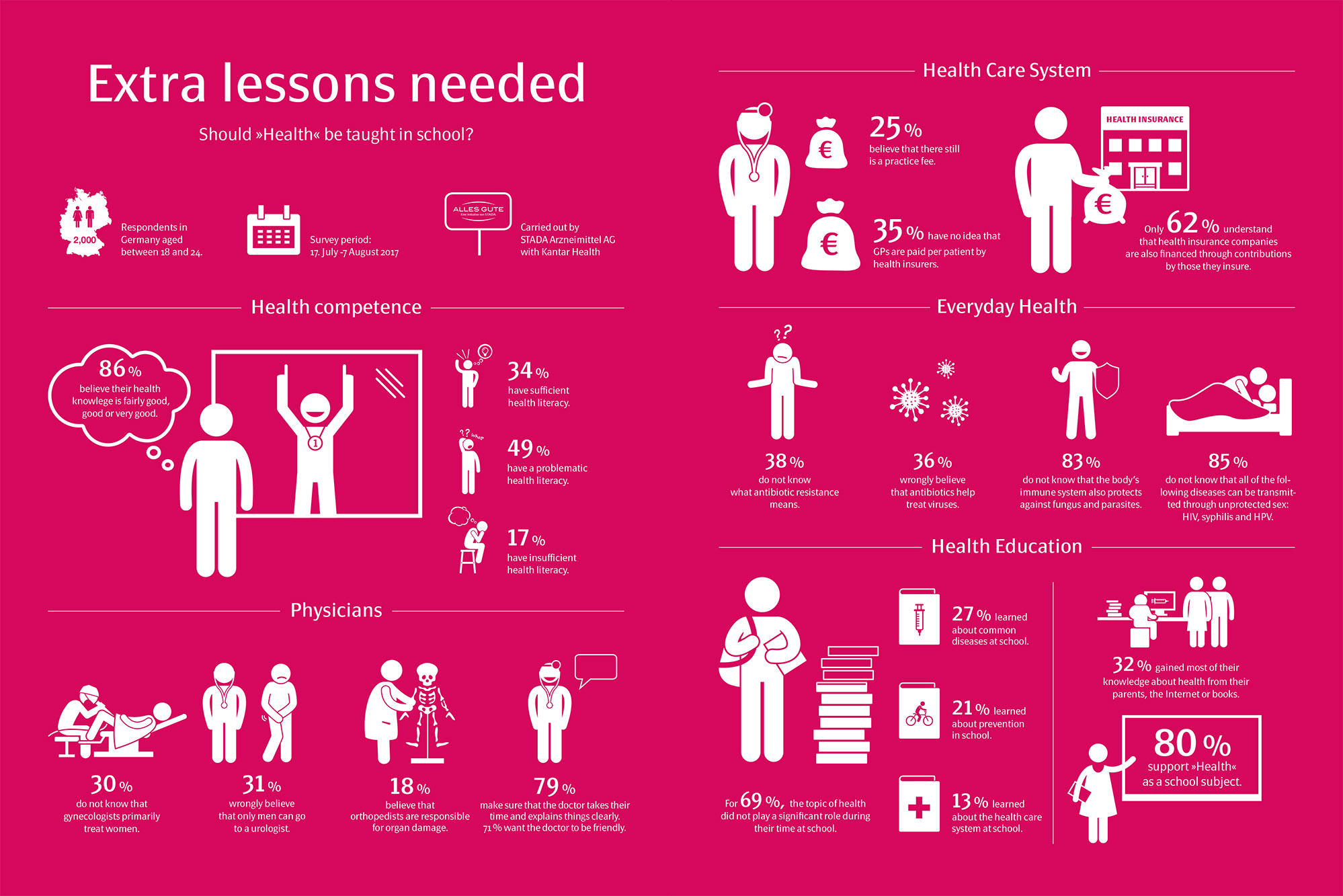 The results are alarming: Young people lack knowledge when it comes to health education. Far too many of the next generation cannot answer basic questions on important health-related topics. STADA is therefore supporting calls for schools to teach our children more intensively about health. People for whom health played a major role at school were found to have an above-average level of health literacy in the STADA Health Report 2017. 80 percent of the 18 to 24-year-olds questioned in the representative survey would like health to be a subject at school. Health topics have so far only been discussed as individual projects in our classrooms, for example within existing subjects. But that is not enough. We need »Health« to be a school subject.