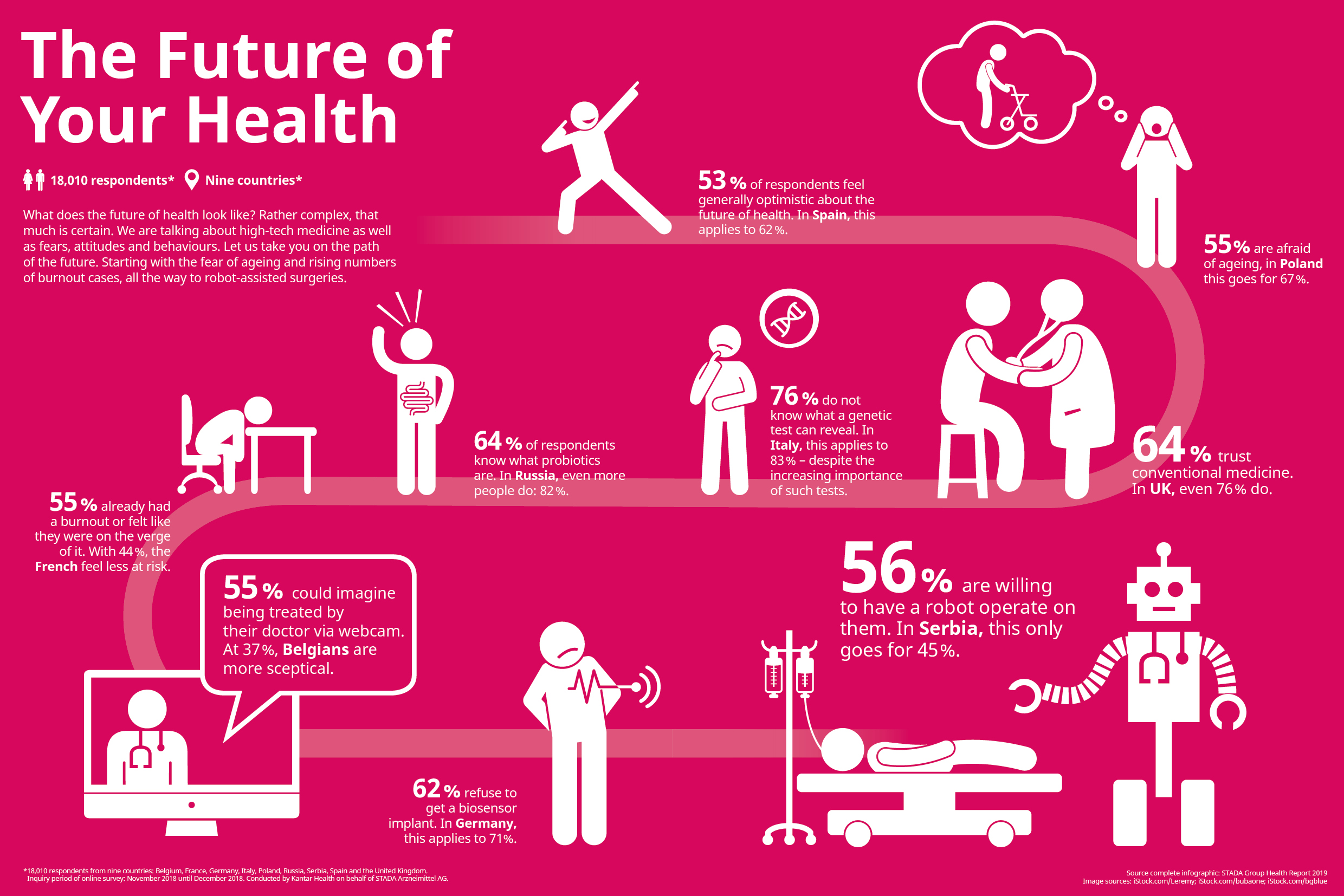 56 percent of Europeans would undergo surgery with “Dr Robot” and 54 percent would receive treatment from their GP via webcam. These are two key findings of the STADA Health Report 2019. The study stands under the sign of the Future of Health and includes 18,000 respondents from nine European countries. The report also shows that 4 out of 5 Europeans would take a gene test and 38 percent would be willing to get a biosensor implant. Looking at the results in detail, interesting disparities come to light between the individual countries. Who is ready for the future of health?