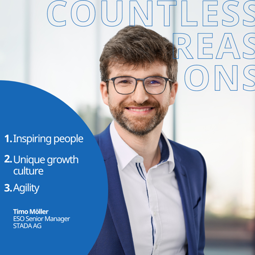 For me personally choosing STADA as an employer offers the opportunity to change my perspective on pharmaceutical industry and externally supplied medicines coming from CMO business in my previous role. STADA is driven by a unique growth culture that is inspiring and offers various opportunities for personnel and professional growth ,which is the key fact for me to keep choosing STADA.