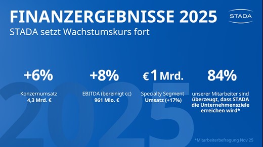 - Der Umsatz des STADA-Segments Specialty übersteigt 2025 erstmals €1 Mrd., getrieben von einem Wachstum von 17 % durch Biosimilars und innovative Arzneimittel