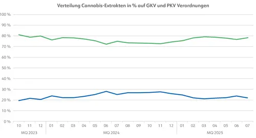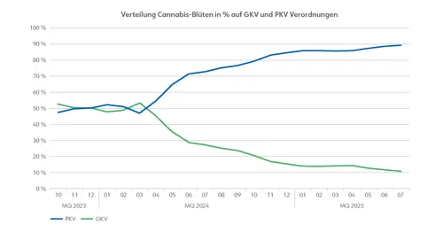 Dabei ist auch zu berücksichtigen, dass die abgegebenen Mengen an Cannabisblüten im GKV-Markt relativ konstant geblieben sind, während der Absatz im PKV-Markt deutlich anwächst.