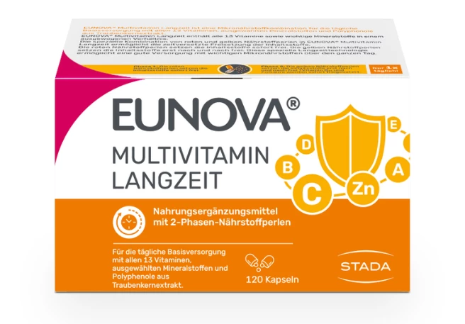 Für die Nahrungsergänzung bei Menschen ab 50 Jahren wurde EUNOVA® Langzeit 50+ entwickelt. Neben der Eunova-Langzeit-Technologie verfügt das Produkt auch über ein Plus an pflanzlichen Antioxidantien. EUNOVA® Langzeit 50+ enthält neben allen wichtigen Vitaminen, Mineralstoffen und Spurenelementen auch Lutein und Lycopin, die zu den Carotinoiden gehören. Lutein, Lycopin und Vitamin E sind hoch dosiert. Durch die Eunova-Langzeit-Technologie werden fast alle wasserlöslichen Vitamine über mehrere Stunden nach und nach freigesetzt. Lediglich bei Vitamin B12 und Folsäure wurde bewusst auf eine zeitverzögerte Freisetzung verzichtet, um eine optimale Aufnahme zu gewährleisten.