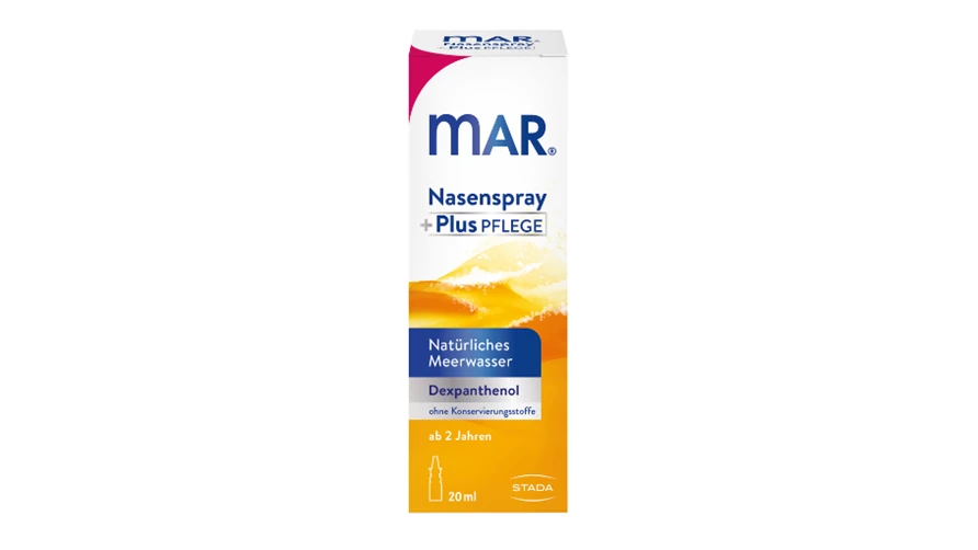 Unsere Nase bereitet die Atemluft auf, bevor sie in Bronchien gelangt. Die eingeatmete Luft wird in der Nase zunächst erwärmt, gefiltert und gereinigt, sodass die Aufnahme von Staub, Pollen und Keimen gemindert wird. Um diese Filter- und Schutzfunktion der Flimmerhärchen in der Nase zu sichern, muss die Nasenschleimhaut intakt gehalten werden. Denn durch trockene Luft, wie sie durch die Nutzung von Heizung oder Klimaanlage entsteht, besteht Austrocknungsgefahr. Auch bei allergischen Beschwerden ist die Unterstützung der gereizten Nasenschleimhaut sinnvoll. Genau dafür ist MAR® Nasenspray Plus Pflege geeignet: Das Meerwasser-Nasenspray ist heilungsfördernd bei wunder Nasenschleimhaut und pflegt mit 3 % Dexpanthenol. Das Nasenspray von MAR® ist bereits für Kleinkinder ab 2 Jahren geeignet.