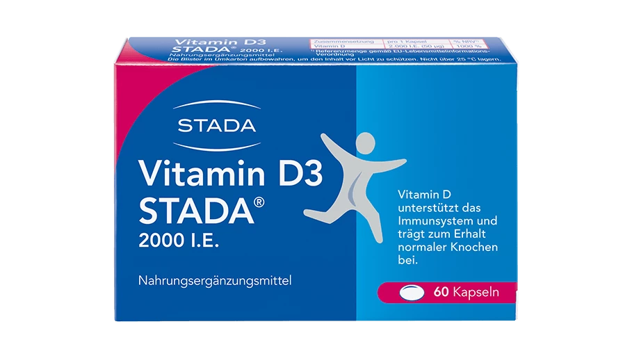 Vitamin D3 kann auch mit der Nahrung oder Nahrungsergänzungsmitteln, wie z. B. Vitamin D3 STADA® 2000 I.E., eingenommen werden.