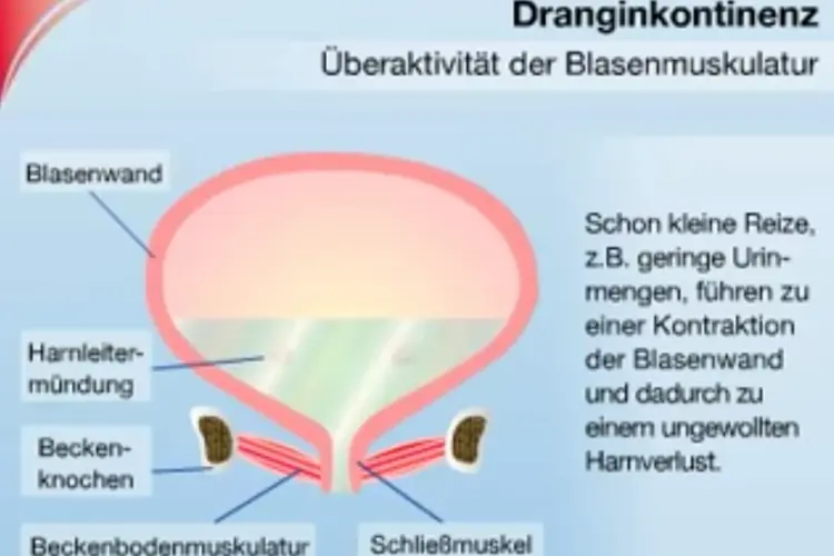 - Der Blasenmuskel zieht sich zusammen und ruft starken Drang und unkontrollierten Urinverlust hervor.
